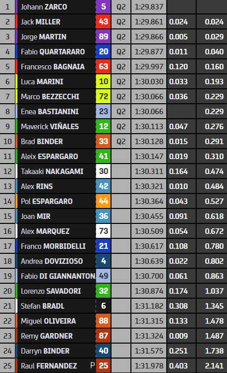 Johann Zarco a signé le meilleur temps de la deuxième séance d’essais libres du Grand Prix d’Autriche, emmenant un top-3 100 % Ducati avec Jack Miller (2ème) et Jorge Martin (3ème). Fabio Quartararo (4ème) fait le boulot et est dans le top-10 provisoirement qualificatif pour la Q2. Pas son rival pour le titre Aleix Espargaro (11ème), qui va devoir croiser les doigts pour avoir une piste sèche pour améliorer en FP3, samedi matin. Dans le cas contraire, ce sera Q1 avec Takaaki Nakagami (12ème), Alex Rins (13ème) ou encore Joan Mir (15ème).