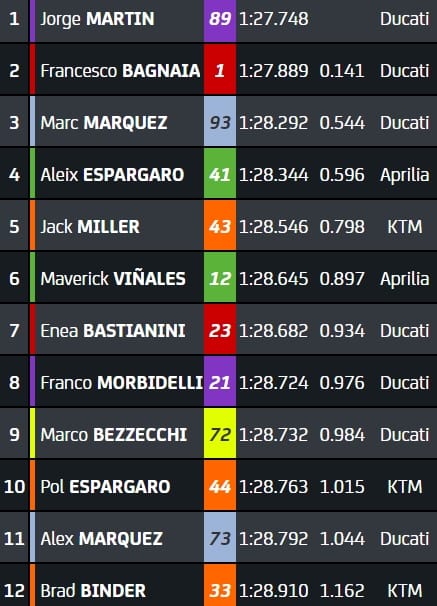 Aucune Desmosedici n'est sur la deuxième rangée. Celle-ci appartient aux Aprilia d'Aleix Espargaro (4e) et Maverick Viñales (6e), qui prennent en sandwich Jack Miller (5e) meilleur pilote KTM. Vainqueur à Silverstone début août, Enea Bastianini devra s'élancer de la 7e place. La troisième ligne sera 100 % Ducati et italienne, avec Franco Morbidelli (8e) et Marco Bezzecchi (9e) à ses côtés.
