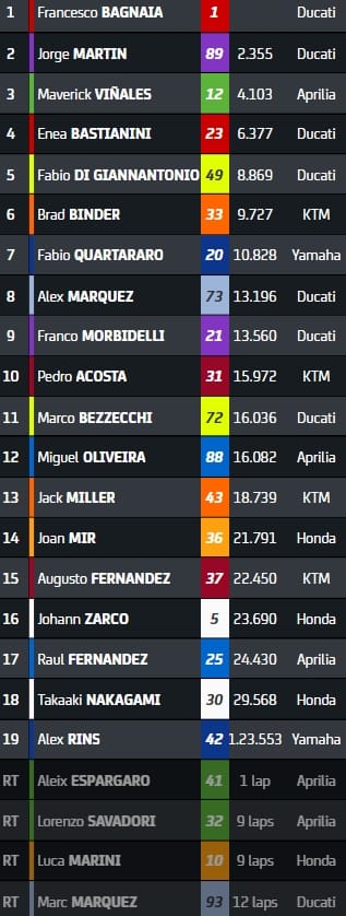 Premier rival des pilotes Ducati depuis vendredi, Maverick Viñales hisse son Aprilia sur le podium du jour. Le seul motif de satisfaction pour la firme de Noale, qui a vu Miguel Oliveira terminer 12e, Raul Fernandez 17e après un long lap, et Aleix Espargaro tomber dans le dernier tour alors qu'il était 6e. Il cède sa place à Brad Binder, meilleur pilote KTM derrière les Desmosedici des Italiens Enea Bastianini (4e) et Fabio di Giannantonio (5e).