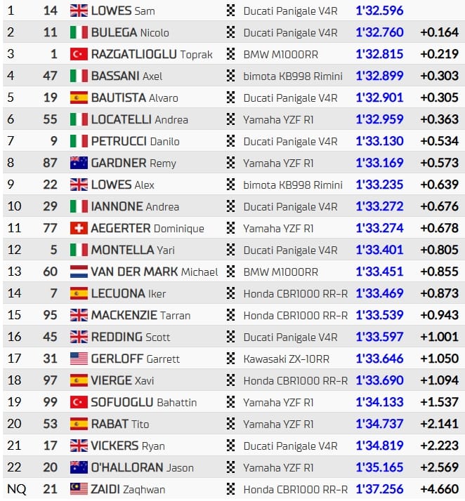 Sam Lowes décroche à Assen sa première Superpole en World Superbike, devançant le leader du championnat Nicolo Bulega (2e) et son dauphin Toprak Razgatlioglu (3e). Axel Bassani (4e) fait briller Bimota devant Alvaro Bautista (5e) et la Yamaha d'Andrea Locatelli (6e).