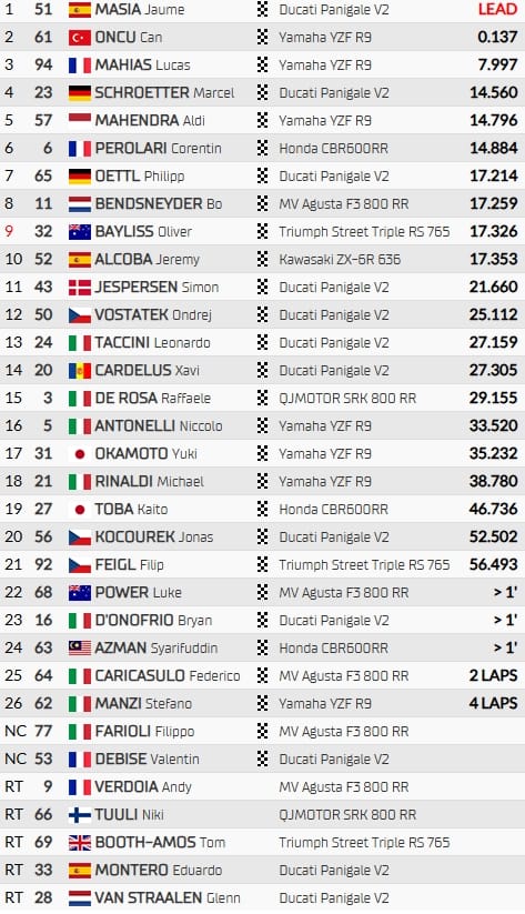 Parti 15e, Jaume Masia a réussi à revenir sur les leaders et dépasser Can Oncu dans l'avant-dernier virage. Il décroche sa première victoire en World Supersport, lui dont le dernier succès remontait au Grand Prix du Qatar en Moto3. C'est aussi la première victoire de l'année pour Ducati.