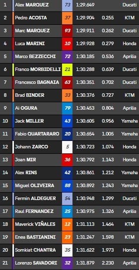 Si Pedro Acosta s'est montré le plus rapide de l'après-midi en 1'30.052, ce n'est pas suffisant pour déloger Alex Marquez de la meilleure place sur l'ensemble de la journée. Ni même pour améliorer sa référence personnelle (1'29.904). Les trois prochaines heures devraient être plus fournies en termes d'activité.