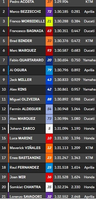 Il est 12h au circuit Chang et Pedro Acosta trône au sommet du classement avec le seul chrono de la matinée sous les 1'30 pour le moment (1'29.904). Suivent les Italiens Marco Bezzecchi et Franco Morbidelli, dans un podium provisoire composé de trois marques différentes (KTM, Aprilia, Ducati).