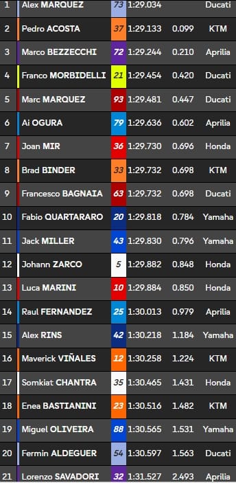 L'Espagnol devance son compatriote Pedro Acosta, qui signe le nouveau record d'une KTM à Buriram en 1'29.133. Même chose pour Marco Bezzecchi avec Aprilia, l'Italien pointant 3e en 1'29.244. Les Ducatistes Franco Morbidelli et Marc Marquez complètent le Top 5 à un peu moins d'une demi-seconde.
