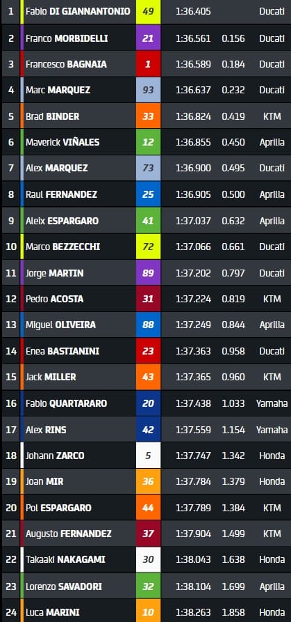 Niveau chronos, la matinée a été dominée par Ducati qui place quatre machines aux quatre premières places : Fabio di Giannantonio devant Franco Morbidelli, Francesco Bagnaia et Marc Marquez. La référence est de 1'36.405, dont à 0,380s du record absolu de la piste. Pour rappel, l'objectif des pilotes n'est pas forcément de signer les meilleurs temps ici, mais plutôt de développer et prendre le temps de faire du travail qui ne peut être réalisé lors des Grands Prix.