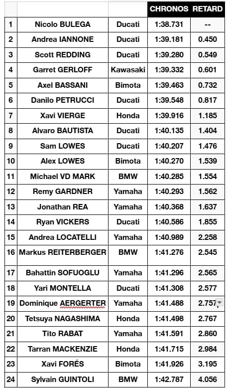 Nicolo Bulega a signé le meilleur temps du premier jour du test de Jerez, avec une marge de 0,450s sur Andrea Iannone et 0,549s sur Scott Redding qui signe un retour intéressant sur la Ducati. Le champion du monde en titre Toprak Razgatlioglu n'est pas présent mais espère être rétabli de sa blessure pour rouler à Portimao dans quelques jours.