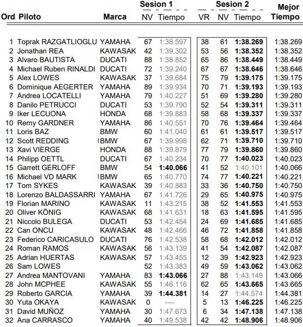 Jonathan Rea (Kawasaki Racing Team WorldSBK) a placé sa ZX-10RR en deuxième position à moins d’un dixième de Razgatlioglu. Rea et son coéquipier Alex Lowes ont travaillé sur les réglages de leurs ZX-10RR. Lowes a fini cinquième, à neuf dixièmes de Rea.