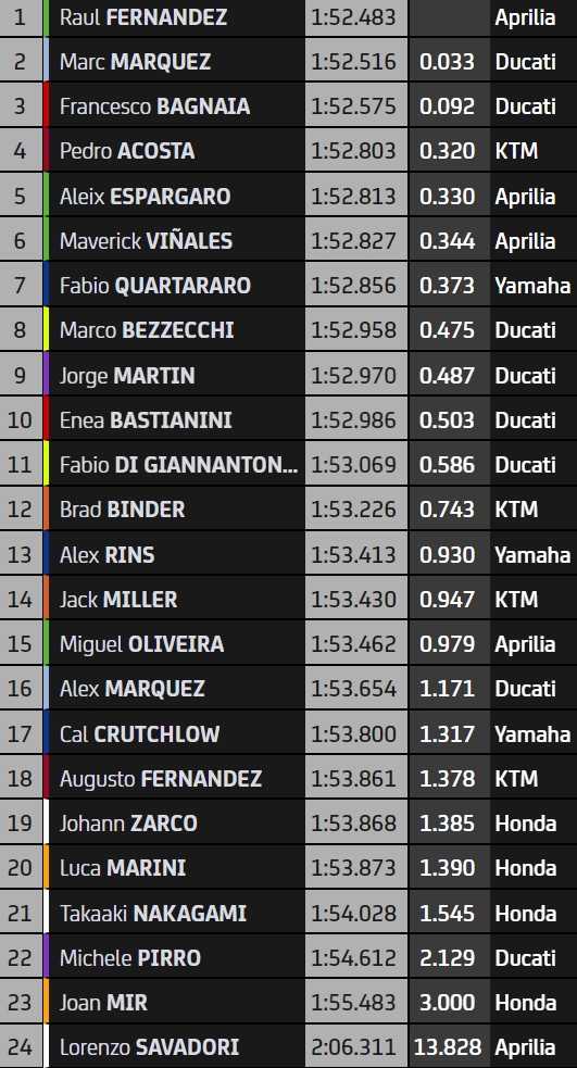 Raul Fernandez est en tête en 1’52.483, un temps réalisé au guidon de la seule Aprilia RS-GP modèle 2023 du plateau, les autres étant équipés de la version 2024. Il devance de 33 millièmes Marc Marquez, qui compte 20 tours à son actif. L’Espagnol a été victime d’un souci technique en première partie de journal, avant de finalement pouvoir engranger des kilomètres avec sa Ducati. Francesco Bagnaia complète le podium provisoire du jour, et les trois hommes se tiennent en moins d’un centième.