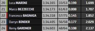Test MotoGP Mandalika – J1 (chronos / tours / écarts) :