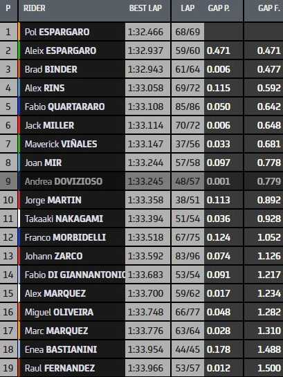 Déjà deuxième à Sepang la semaine dernière, Aleix Espargaro se maintient à ce niveau (+0.471). KTM réagit après des essais malaisiens difficiles avec Brad Binder à une surprenante troisième place (+0.477) . Alex Rins semble confirmer ses progrès faits dans l’exercice du tour rapide (4e, +0.592), tandis que Fabio Quartararo complète le top-5 et reste à son habituelle place de meilleur pilote Yamaha (+0.642). Avec 86 tours au compteur, le Français a beaucoup travaillé et été l’un des plus actifs en piste. Seul son compatriote Johann Zarco a fait plus de kilomètres (13e, +1.126, 96 tours).