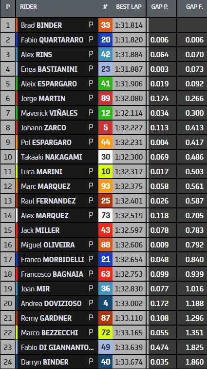 La barre des 1’31 a été atteinte à Mandalika ce samedi, pour le deuxième jour du test MotoGP. À 2 heures de la fin du roulage, Brad Binder domine les débats en 1’31.814, avec 6 petits millièmes d’avance sur Fabio Quartararo. Le top-10 se tient en moins d’une demi-seconde.