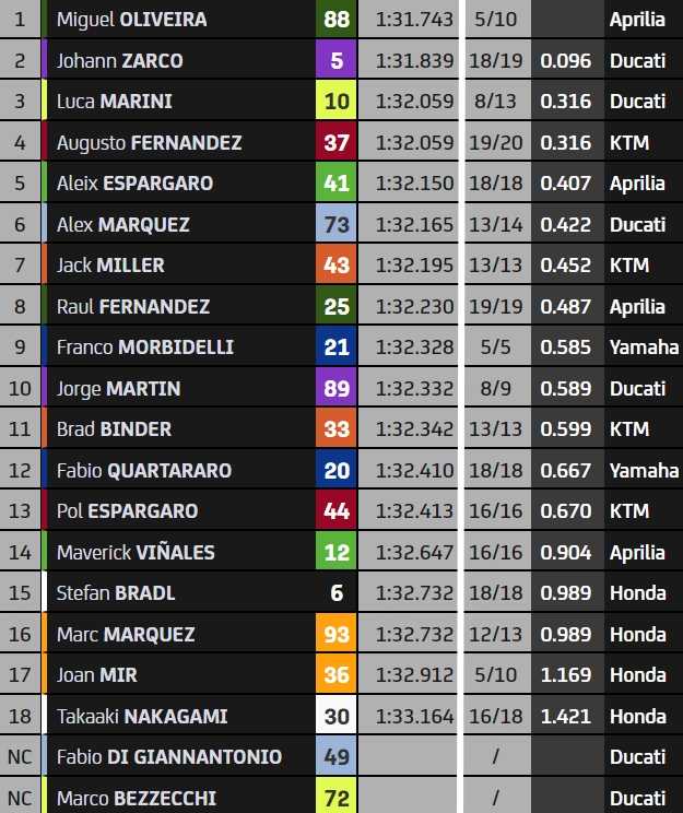 La deuxième heure de roulage se termine et la plupart des pilotes ont roulé. Les 1’30 effectués durant le week-end du Grand Prix ne sont pas encore atteints, mais deux hommes sont descendus en 1’31 : Miguel Oliveira et Johann Zarco. Le Portugais devrait essayer aujourd’hui la version 2023 de l’Aprilia RS-GP, car l’équipe RNF dispose du modèle précédent (la version 2022 en 2023, et la 2023 en 2024). Zarco travaille lui sur sa moto de course actuelle.