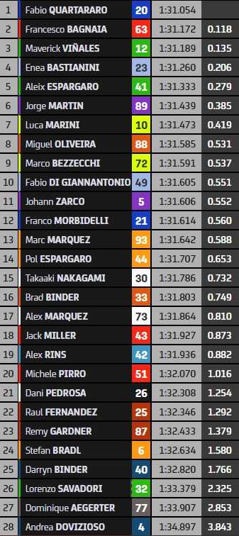 Futur ex-pilote KTM, Miguel Oliveira (8ème) fait office de meilleur représentant de la marque, mais les écarts sont serrés puisque son coéquipier Brad Binder (16ème), qui a roulé aujourd’hui avec ce que Dani Pedrosa (21ème) testait mardi, n’est que deux dixièmes derrière. Le constructeur autrichien met les moyens sur la table pour renverser la vapeur, après une saison 2022 où rares sont les fois où la KTM RC16 joue les premiers rôles.