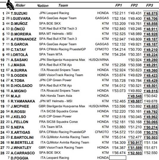 En tenant compte du fait que les GasGas, CFMoto et Husqvarna sont des KTM, la Honda de Tatsuki Suzuki (dont la photo de une remonte au test de Jerez) devance un total de dix pilotes KTM & dérivés. Le Français Lorenzo Fellon termine 22e d’un samedi où le vent et le froid n’ont pas facilité la réalisation de chronos très rapides. La référence, de 1’48.575, est à plus d’une seconde du record du circuit (1’47.274).