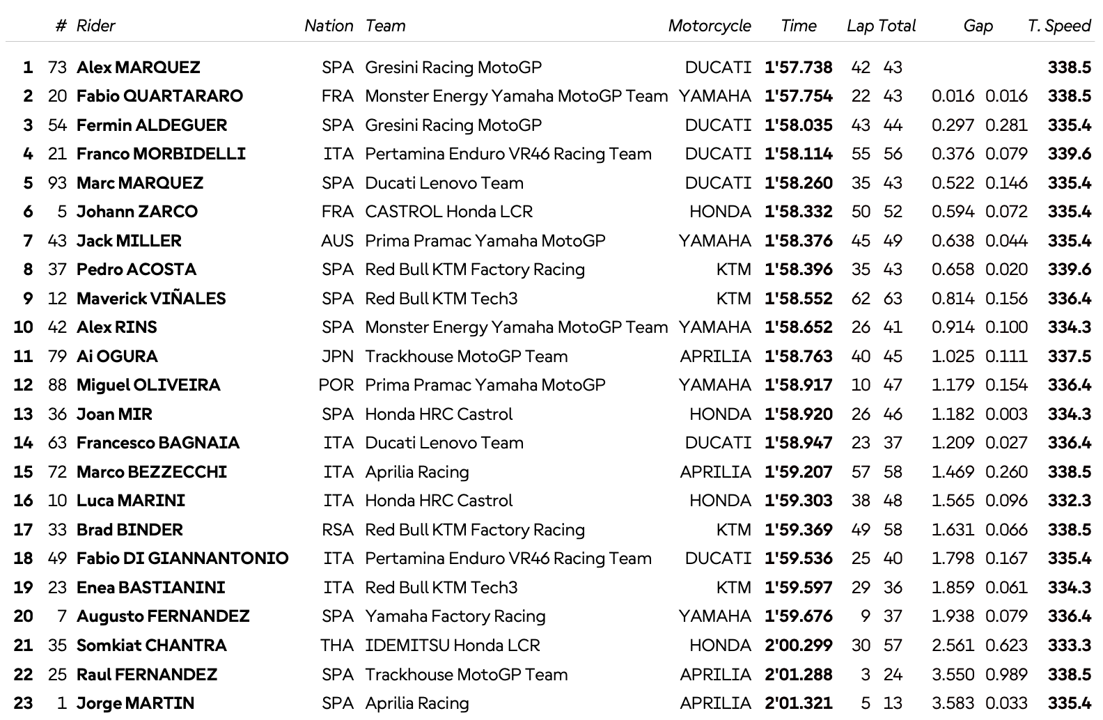 Franco Morbidelli, qui a chuté au virage n°6, sans encombre, occupe la quatrième place tandis que Marc Marquez complète le Top 5 à un peu plus d’une demi-seconde de son frère Alex. Johann Zarco place la première Honda du classement en sixième position devant Jack Miller et Pedro Acosta.