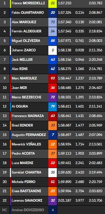 La deuxième journée du test de Sepang est en cours, sans les blessés Jorge Martin, Raul Fernandez et Fabio di Giannantonio. Francesco Bagnaia a chuté dans le dernier virage mais ne s'est visiblement pas fait mal. Du reste, c'est plutôt calme... avec des chronos qui commencent à approcher les 1'56 !