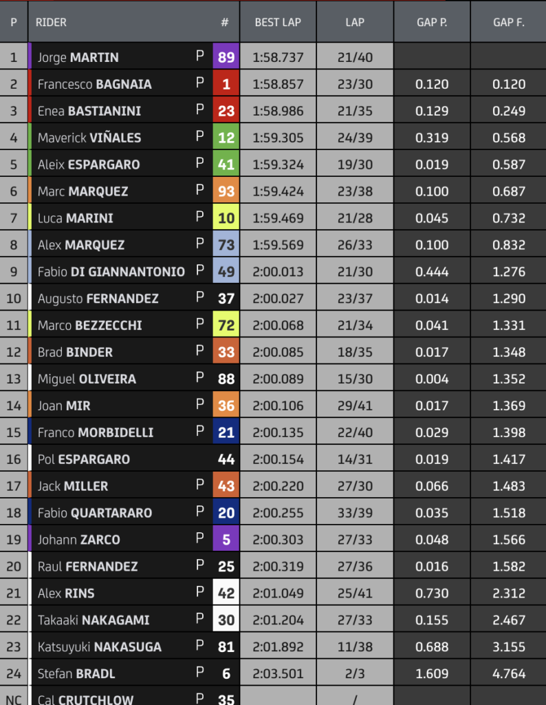 Après quatre heures de roulage, Jorge Martin figure toujours en tête du classement avec un chrono en 158.737 établi un peu plus tôt dans la matinée. Il devance les deux pilotes Ducati, Francesco Bagnaia et Enea Bastianini.