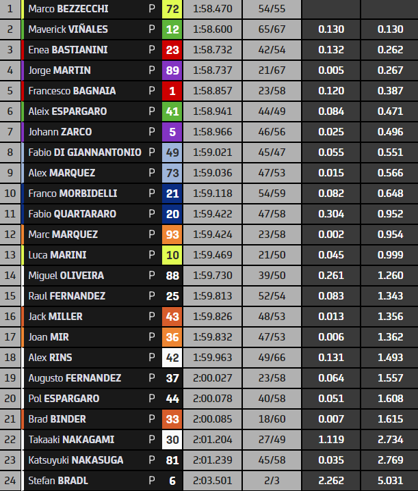 L’Italie est bien représentée puisque neuf motos transalpines pointent au neuf premiers rangs. Au-delà des cinq premiers, Aleix Espargaro place son Aprilia en sixième position devant Johann Zarco. Le pilote français a progressé tout au long de la journée pour terminer à près de cinq dixièmes de Marco Bezzecchi. Les deux Gresini Racing de Fabio Di Giannantonio et Alex Marquez suivent ensuite.