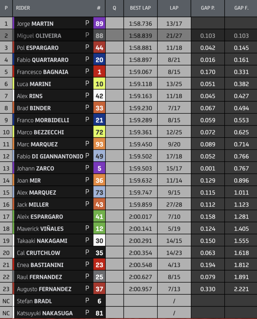 Après 4h de séance, Jorge Martin occupe le première place avec un chrono en 1’58.736. Le Madrilène compte un peu plus d’un dixième d’avance sur Miguel Oliveira. Pol Espargaro place sa GasGas au quatrième rang juste devant Francesco Bagnaia ; Quartararo étant le dernier pilote classé sous la barre des 1’59.