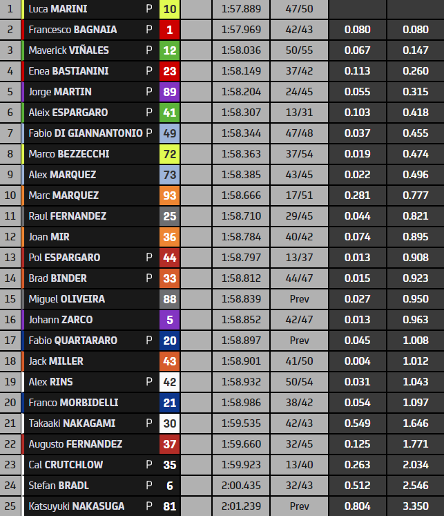 Maverick Viñales est un solide troisième à 147 millièmes. Enea Bastianini et Jorge Martin complètent le top-5. Johann Zarco se classe seizième (+0’’963). Le pilote Ducati Pramac est talonné par Fabio Quartararo, dix-septième, à plus d’une seconde de la tête.