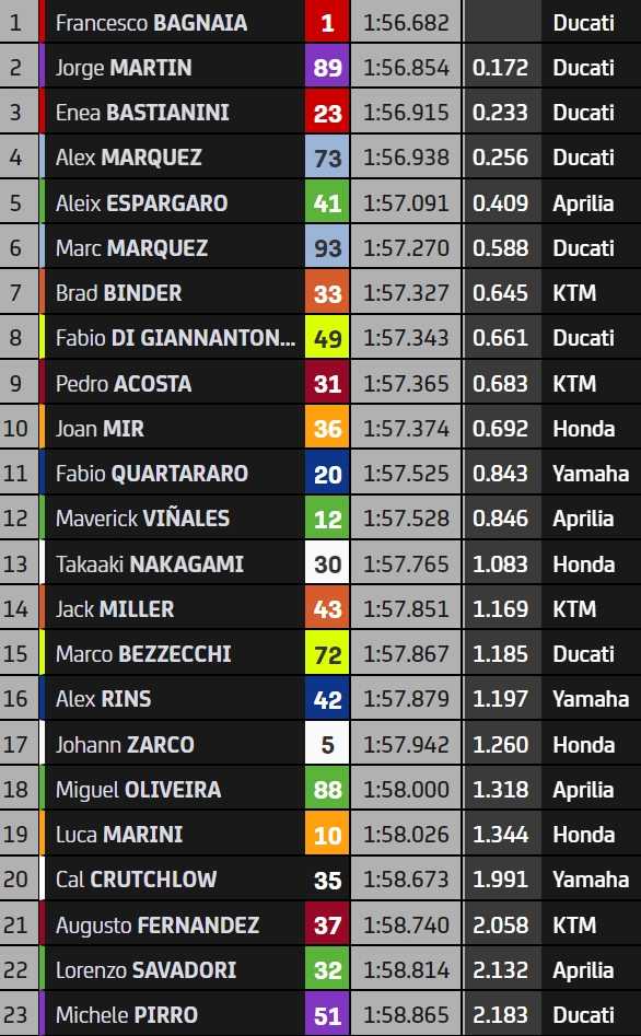 Le record officiel du circuit, le 1’57.491 réalisé par Francesco Bagnaia lors de sa pole position du Grand Prix de Malaisie 2023, le 11 novembre dernier, a été battu par 10 pilotes… et atomisé par le même Bagnaia, descendu en 1’56.682. 8 dixièmes de gagnés alors que Ducati dicte sa loi dans le top-4 : le double-champion du monde MotoGP devance Jorge Martin, Enea Bastianini et Alex Marquez. Le top-5 aurait pu être 100 % Ducatiste avec Marc Marquez, mais l’Espagnol est 6e, devancé de peu par Aleix Espargaro et son Aprilia.