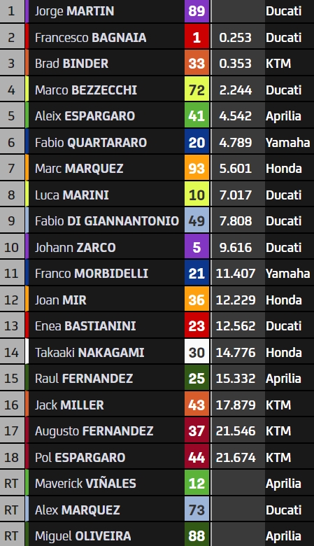Le n°33 semble en route vers sa première victoire depuis le Grand Prix d’Autriche 2021, mais le Martinator n’a pas dit son dernier mot. Il reprend les commandes dans l’avant-dernier tour, grâce à un intérieur musclé et effectué en deux temps au virage 3. En dépit de tous ses efforts, Binder ne parvient pas à répliquer. L’Espagnol décroche l’un des plus beaux succès de sa carrière devant le Sud-Africain, qui perd une position pour être passé dans la partie verte du circuit dans le dernier tour. Il est donc classé troisième, sa deuxième place revenant à Bagnaia.
