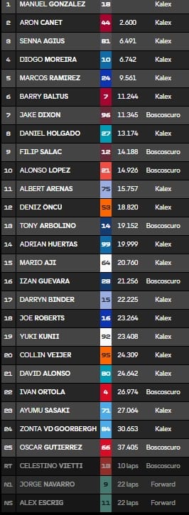 Manuel Gonzalez a remporté de main de maître la première course Moto2 de la asison à Buriram. Il s'impose devant son compatriote espagnol Aron Canet et l'Australien Senna Agius, en dépit d'un Long Lap effectué pour avoir percuté Celestino Vietti. Le Belge Barry Baltus termine à une excellente sixième place, dans un top-6 entièrement composé de châssis Kalex.