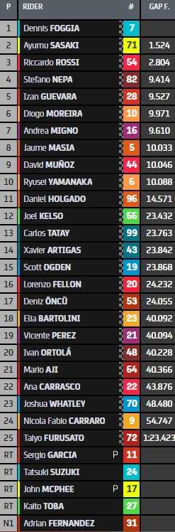 Tombé, Sergio Garcia perd gros puisqu’il cède sa deuxième place du championnat à Dennis Foggia, et se retrouve à 56 longueurs d’Izan Guevara. Le leader du championnat compte 49 points d’avance sur son nouveau dauphin, alors que 50 resteront à distribuer après la prochaine course à Phillip Island, le 16 octobre. Il est mathématiquement en mesure d’être titré dès le prochain Grand Prix.