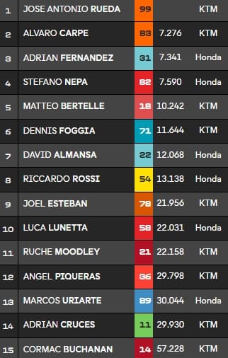 La course a été marquée par de nombreuses chutes et 11 abandons. Percuté par Joel Kelso, Angel Piqueras a réussi à repartir pour terminer 12e et ainsi sauver 4 points. Devant, Rueda récupère les 25 unités accordées au vainqueur. Ci-dessous les 15 pilotes classés.