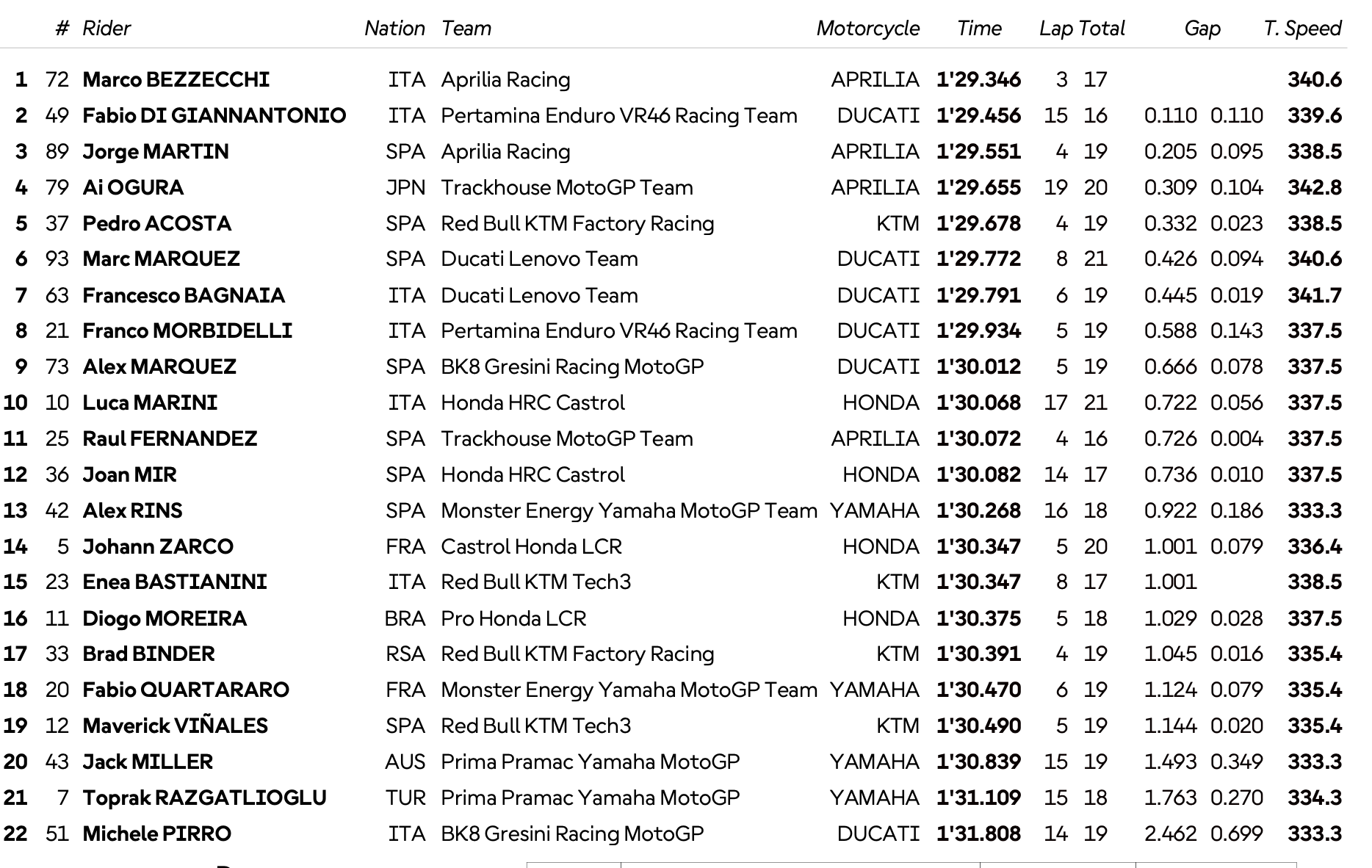 La hiérarchie se met vite en place aux avant-postes. Fabio Di Giannantonio échoue de peu, concédant 0.110s au leader. Jorge Martin complète ce premier Top 3 en pointant à 0.205s, malgré une petite glissade dans le dernier virage au cours de la séance.