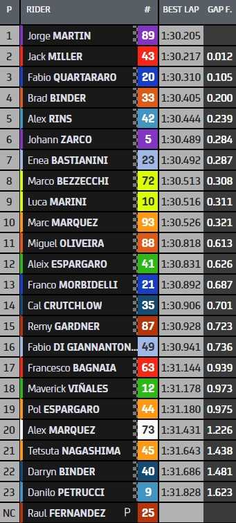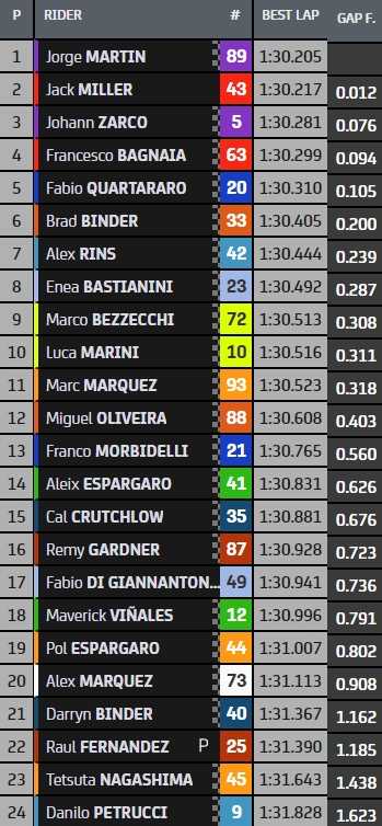 Troisième de la FP3 et cinquième du général, Fabio Quartararo est le premier pilote non-Ducati au guidon de sa Yamaha, devant Brad Binder et sa KTM, puis Alex Rins et sa Suzuki. Enea Bastianini, Marco Bezzecchi et Luca Marini complètent le top-10 directement qualificatif pour la Q2.