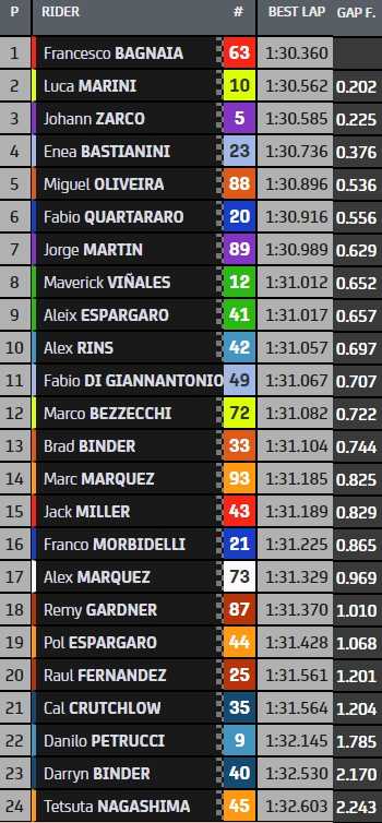 Francesco Bagnaia a signé le meilleur temps du warm-up à Buriram, dernière séance avant la course du Grand Prix de Thaïlande. Il devance les Ducati de Luca Marini, Johann Zarco et Enea Bastianini, dans un top-4 dominé par la marque italienne. Le leader du mondial, Fabio Quartararo, est sixième.