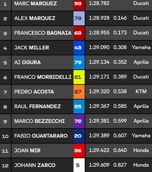- Doublé des Marquez avec Alex 2e, et triplé Ducati avec Bagnaia 3e. Pas de surprise chez les leaders, sur une piste où la marque italienne avait verrouillé les 5 premiers places de la grille en octobre dernier.