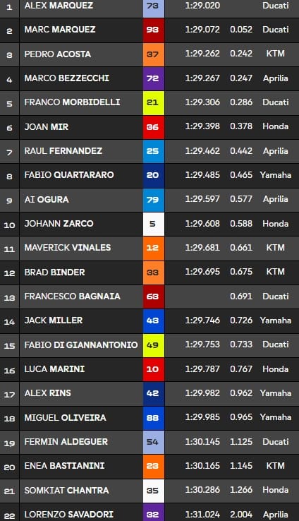 La première journée du Grand Prix de Thaïlande est terminée. On sait qui sont les 10 pilotes MotoGP qui entreront directement en Q2, de même que les 14 des catégories Moto2 et Moto3. Découvrez tous les résultats du jour.