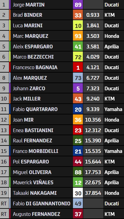 Martin reprend 9 points à Bagnaia, qui n’en a plus que 18 d’avance sur l’Espagnol en tête du championnat. Un changement de leader est donc possible ce dimanche, puisque 25 unités seront en jeu. Malgré son podium du jour, Binder est désormais mathématiquement éliminé de la course au titre, où il ne reste plus que le duo italo-espagnol et Bezzecchi, désormais à 72 points.