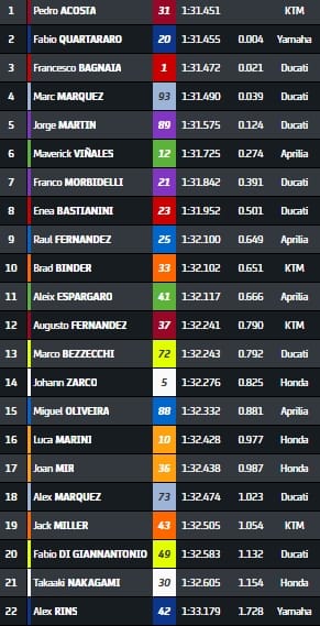 Fabio Quartararo était parti pour signer le meilleur temps de la deuxième séance d'essais libres MotoGP, ce samedi matin, mais Pedro Acosta l'a devancé de 0,004s. Marc Marquez a terminé la session sur une chute, sans gravité. Place désormais aux qualifications dans quelques minutes.