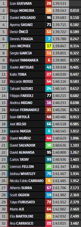 Izan Guevara a signé le meilleur temps de la première séance d’essais libres Moto3 du Grand Prix de Valence. Le champion du monde, qui vit son dernier week-end dans la petite catégorie, devance les débutants Diogo Moreira et Daniel Holgado. Le Français Lorenzo Fellon est 24ème.