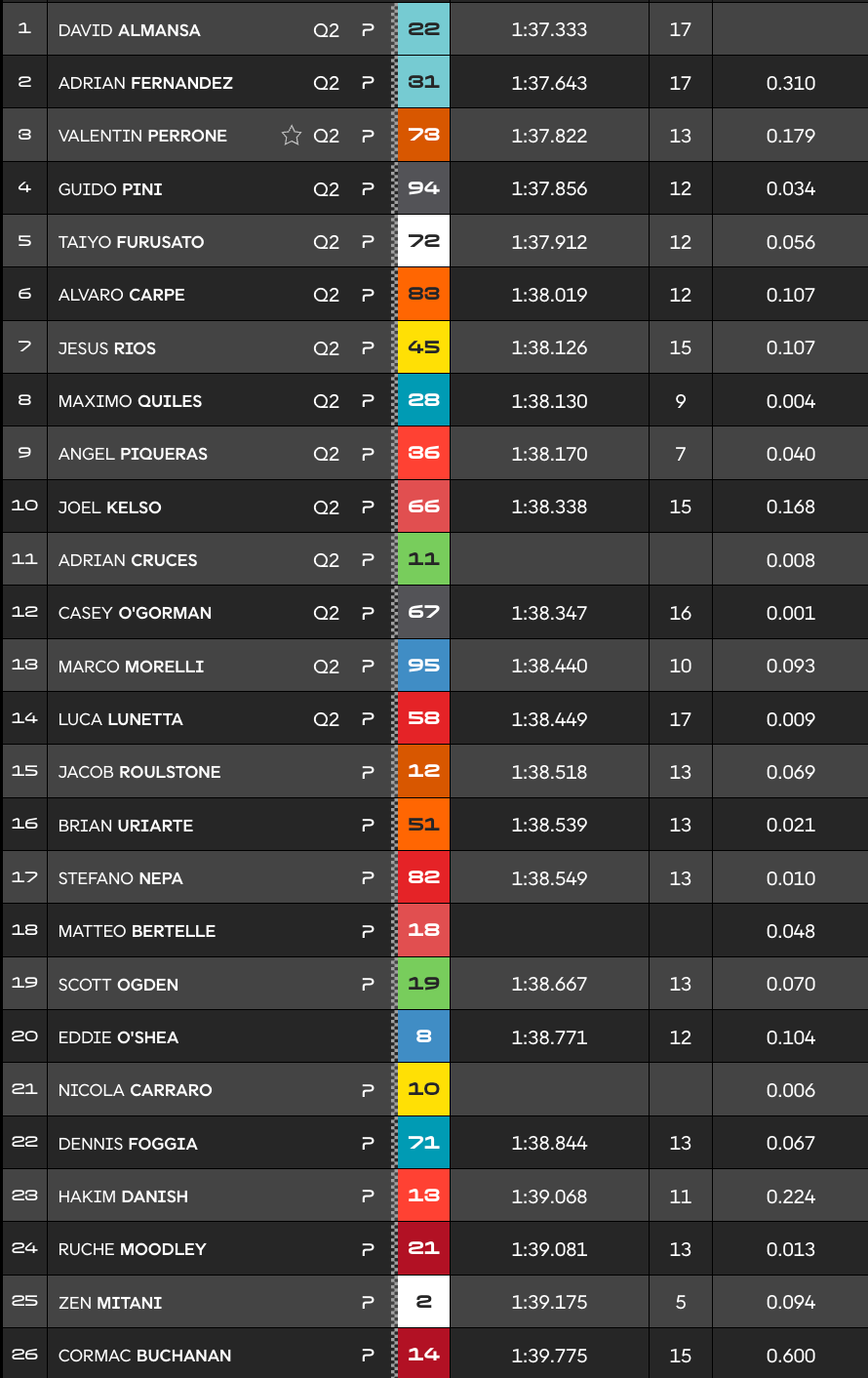 Taiyo Furusato s'est adjugé le cinquième temps devant Alvaro Carpe, leader ce matin et Jesus Rios. Maximo Quiles a hérité huitième temps devant Angel Piqueras et Joel Kelso.