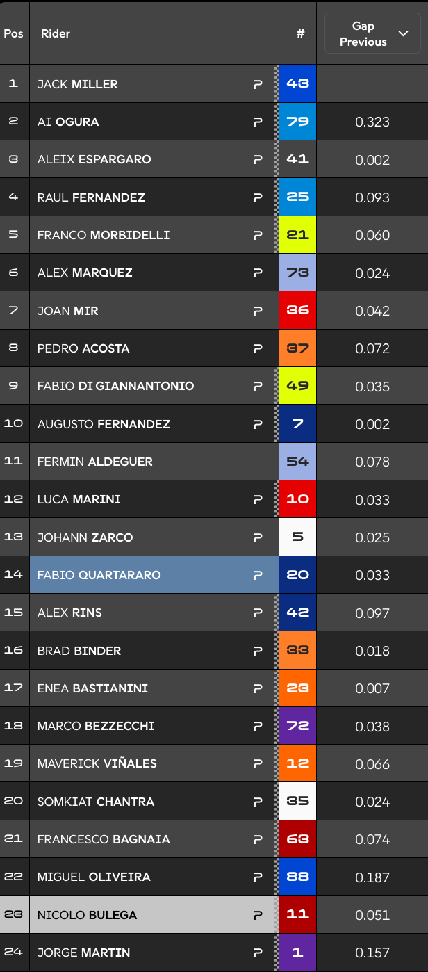 Raul Fernandez, qui a dû déclaré forfait la semaine dernière au GP du Portugal, place une deuxième Aprilia en quatrième position devant la première Ducati de la hiérarchie, celle de Franco Morbidelli. Alex Marquez occupe la sixième position devant Joan Mir et Fabio Di Giannantonio.