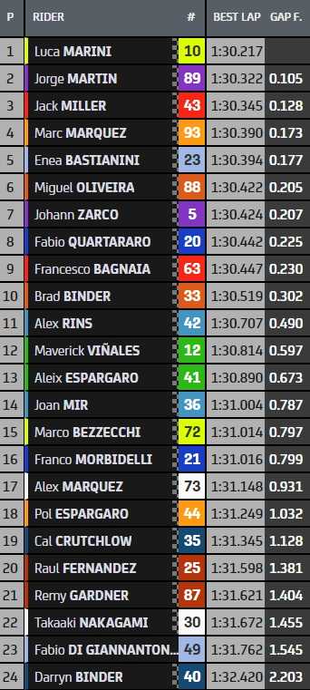 Descendu en 1’30.217, Luca Marini s’est montré le plus rapide devant Jorge Martin et Jack Miller. Quatrième, Marc Marquez est le premier pilote d’un autre constructeur au guidon de sa Honda en dépit d’une chute en début de session, sa deuxième du week-end. Enea Bastianini place une quatrième Ducati dans le top-5, séparé de seulement 177 millièmes. Des écarts très faibles favorisés par la longueur du circuit, l’un des plus courts du calendrier.