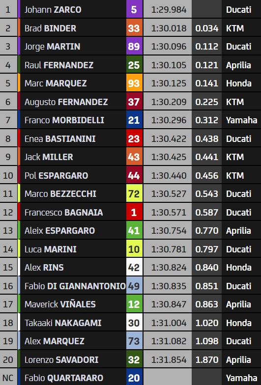 Johann Zarco a signé le meilleur temps du warm-up du Grand Prix de Valence, battant de justesse Brad Binder (+0.034). Son coéquipier Jorge Martin est troisième (+0.112) après avoir roulé en pneus medium. Francesco Bagnaia, qui a chaussé les pneus tendres, s’est classé douzième. Place aux dernières courses de la saison !