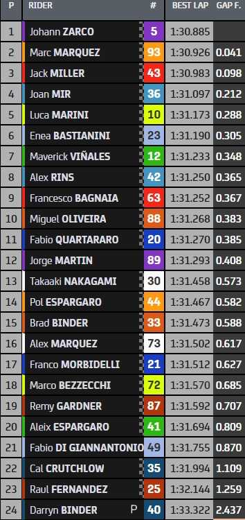 Johann Zarco a dominé le warm-up de Valence, dernière séance d’essais de la saison 2022. Il devance Marc Marquez et Jack Miller, tous deux à moins d’un dixième du Français. Place aux courses au circuit Ricardo Tormo.