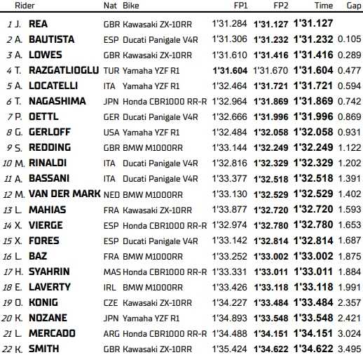 Jonathan Rea a signé le meilleur temps de la première journée du WorldSBK de Phillip Island, grâce à un chrono de 1¡31.127. Le nouveau champion du monde, Alvaro Bautista, suit à un dixième, tandis qu’Alex Lowes complète le top-3. Impressionnante sixième place de Tetsuta Nagashima sur la Honda pour ses débuts en mondial Superbike. Lucas Mahias (13ème) est de retour après son forfait à Mandalika, et fait un peu mieux que son compatriote français Loris Baz (16ème).
