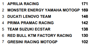Avec huit points inscrits de plus qu’Aprilia Racing, l’écurie Monster Energy Yamaha recolle à sa rivales au championnat des équipes. De son côté, le Ducati Lenovo Team paye son mauvais week-end catalan et perd du terrain.