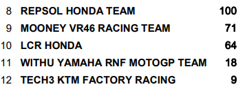 En revanche, l’équipe satellite Pramac Racing signe une très bonne remontée. Jorge Martin, deuxième, et Johann Zarco, troisième, permettent à leur team de marquer 36 points et de recoller à quatre unités du team officiel, en quatrième position du classement. Côté tricolore, l’écurie Tech3 a réalisé son meilleur week-end de l’année. Les deux pilotes de l’équipe, Remy Gardner (11e) et Raúl Fernández (15e), sont pour la première fois rentrés tous les deux dans le top 15.